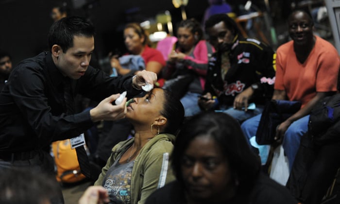 Complex domestic problems deserve attention too. Here a woman in Los Angeles receives eye drops from a volunteer medic offering free services to those without health insurance and in need. Photograph: Mark Ralston/AFP/Getty Images